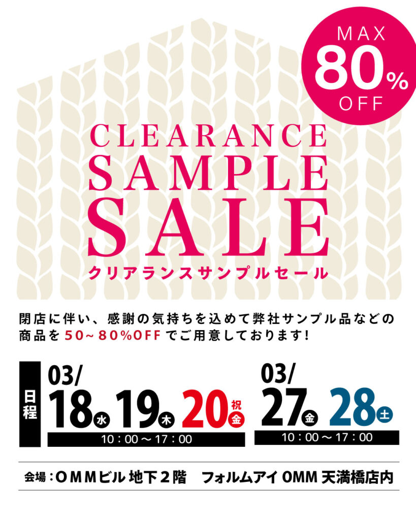 フォルムアイ OMM天満橋店 閉店に伴い、感謝の気持ちを込めて弊社サンプル品などの商品を最大80%OFFでご用意しております!